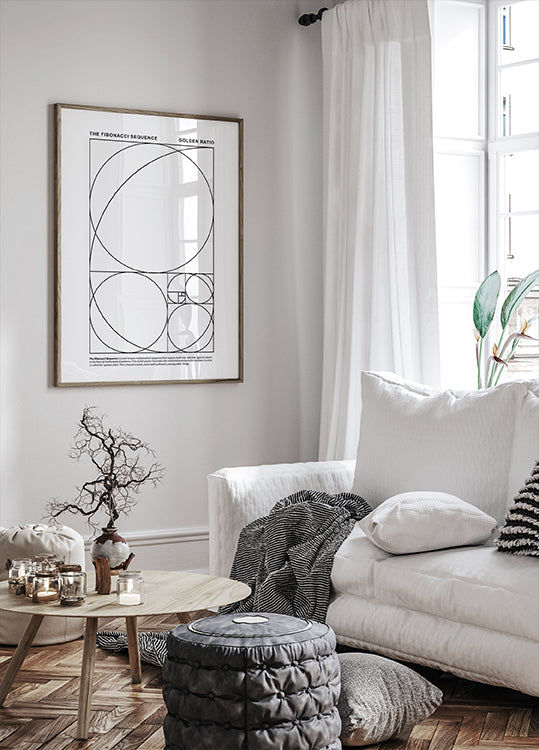 Un poster matematico minimalista che illustra la sequenza di Fibonacci e la sezione aurea. Questo design elegante mette in mostra le relazioni geometriche presenti in natura, arte e architettura. Perfetto per gli amanti della matematica, gli studenti e gli amanti dell'arredamento moderno.