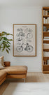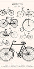 Un'illustrazione dettagliata in bianco e nero di biciclette vintage dal 1871 al 2007. Con modelli iconici come Kenwood, Columbia e Grand Bi, questa opera d'arte nostalgica cattura la storia della bicicletta. Perfetto per la casa, i negozi di biciclette o per aggiungere fascino retrò alla parete di una galleria.