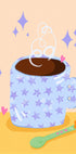 Coffee Time Retro Illustration di Dirkie Nell cattura l'intimità di una scena colorata e di ispirazione retrò: una tazza di caffè fumante con dettagli sorridenti, stelle giocose e un cucchiaino, ambientata in caldi marroni, gialli e rosa. Un'espressione allegra e originale che porta nella stanza l'atmosfera di un caffè, la nostalgia e la gioia di tutti i giorni.