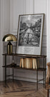 Uno sguardo suggestivo e monocromatico sul Prinsengracht di Amsterdam: biciclette appoggiate alle ringhiere, case galleggianti e case a capanna si riflettono nell'acqua immobile, mentre sullo sfondo si erge la Westerkerk. Un'atmosfera metropolitana senza tempo catturata dall'artista Melanie Viola: elegante, grafica e urbana. Con una tipografia sottile per un'espressione moderna.
