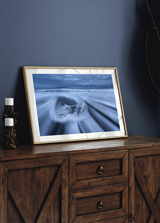 Oplev Jökulsárlóns magi i et drømmende øjeblik: blåis driver mod den sorte sandstrand, mens bølgerne stryger silkeblødt hen over kysten i det første, rosa morgengry. Tågede vandspor og krystalklare isstykker skaber ro og drama på én gang. Fotografi af Jingshu Zhu. En hyldest til Islands rå skønhed ved kanten af islagunen.