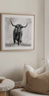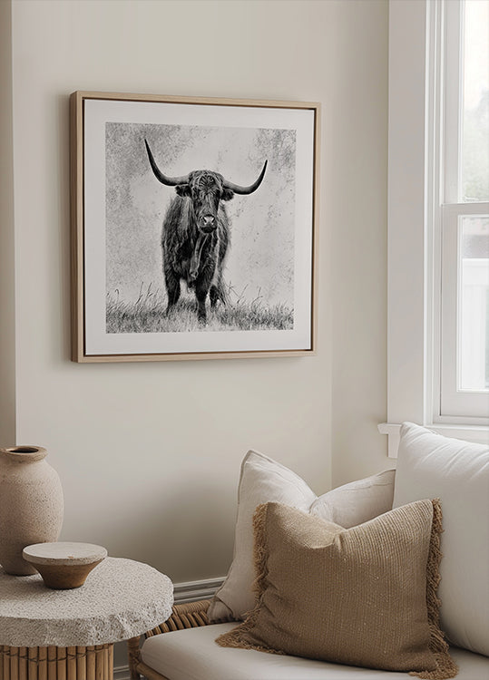 Un iconico bovino scozzese delle Highland emerge in un drammatico bianco e nero, con possenti corna e sguardo profondo, catturato in un'illuminazione ad alta intensità che enfatizza la struttura e la calma. La force di Stéphane Pecqueux unisce forza bruta e poesia rurale: un motivo senza tempo che porta nello spazio la presenza della natura e la semplicità nordica.