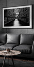 Un viaggio drammatico e monocromatico attraverso il quartiere dei canali di Amburgo: facciate in mattoni e un ponte basso attirano lo sguardo verso l'orizzonte, mentre l'acqua immobile riflette luci e ombre. Stefan Eisele cattura la fresca calma della città con linee strette, simmetria e profondità: un motivo urbano che invita alla contemplazione. Il motivo rende omaggio alla geometria senza tempo di Speicherstadt.