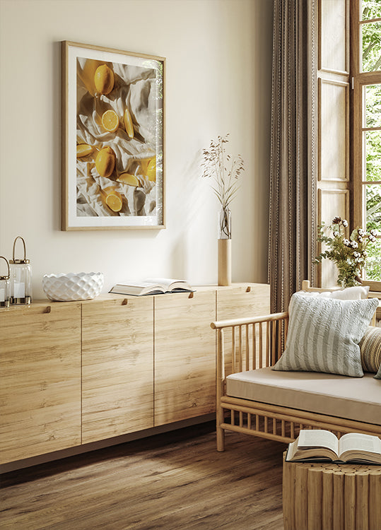 Una natura morta artistica di limoni gialli brillanti, alcuni tagliati a fette, splendidamente disposti su un tessuto bianco testurizzato. La luce del sole filtra, proiettando ombre dinamiche che esaltano il contrasto tra il tessuto morbido e le bucce lucide dei limoni. Perfetta per creare un'atmosfera fresca e rinvigorente in cucina o in sala da pranzo.