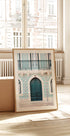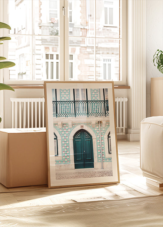 En grøn, klassisk dør i Lissabon rammes ind af hvide og blå azulejos og en elegant bue, hvor sollyset fremhæver patinaen i den gamle facade. Små detaljer som vinduesrammer og flisemønstre skaber rytme og ro. Et tidløst bymotiv af Raisa Zwart, der bringer varme og rejselyst ind i rummet. Perfekt til gangen, stuen eller hjemmekontoret.