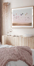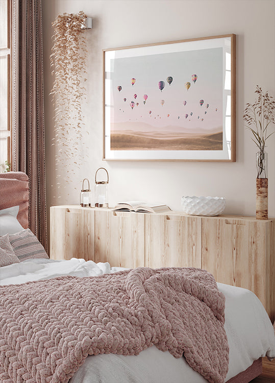 Una fotografia da sogno di mongolfiere colorate che fluttuano sopra dune di sabbia dorata sotto un cielo color pastello. L'opera d'arte cattura la magia del viaggio, della libertà e dell'avventura, rendendola un bellissimo pezzo per qualsiasi arredamento ispirato alla voglia di viaggiare.