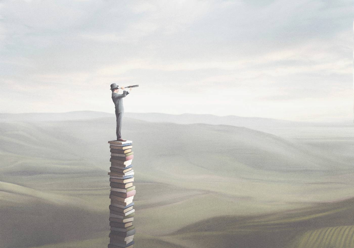 Il poster della Torre dei libri* è un'illustrazione surrealista stimolante che simboleggia la conoscenza, l'apprendimento e nuove prospettive. Un uomo in giacca e cravatta sta su un’alta pila di libri e guarda con un binocolo: una bellissima metafora di come l’educazione e la saggezza aprano gli orizzonti. Perfetto per biblioteche, uffici, aule o per chi ama lo sviluppo personale e l'esplorazione intellettuale.