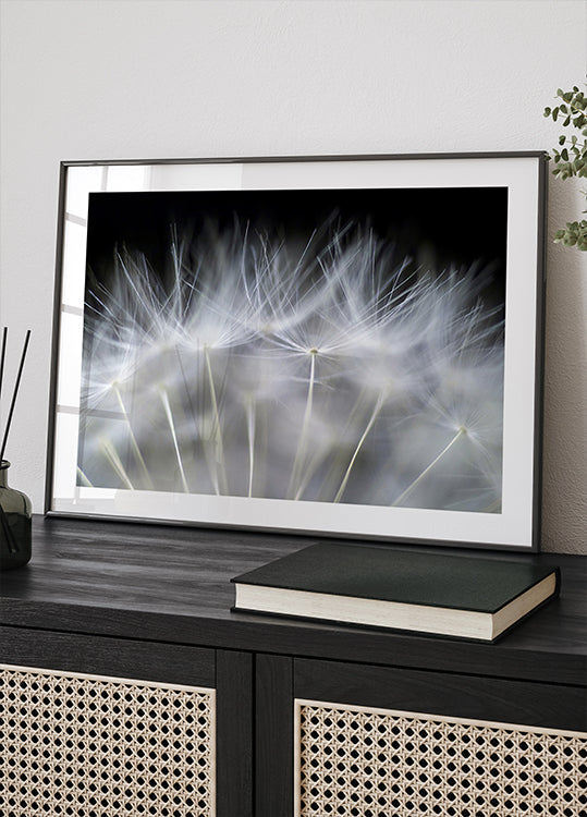 Una delicata fotografia macro dei semi di dente di leone, che cattura la loro soffice morbidezza e bellezza. Il primo piano evidenzia la natura fragile e fugace di questi ariosi ciuffi.