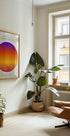 Un'opera d'arte moderna e minimalista con una brillante sfumatura circolare ispirata ai colori del tramonto. Con un mix di viola intenso, arancione brillante e tonalità dorate, questo design astratto crea un punto focale armonioso, perfetto per interni moderni e spazi creativi.