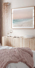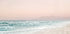 Una tranquilla fotografia costiera che cattura le onde turchesi che lambiscono dolcemente una spiaggia sabbiosa sotto un nebbioso cielo color pastello. Le montagne lontane creano un orizzonte da sogno che evoca tranquillità e atmosfera vacanziera.