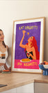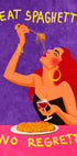 Un'illustrazione audace e giocosa di una donna affascinante che gusta spaghetti e vino rosso con la frase umoristica "Eat Spaghetti, No Regretti". L'opera d'arte combina umorismo, femminilità e stile ed è perfetta come dichiarazione in cucina, sala da pranzo o come decorazione murale moderna.