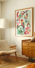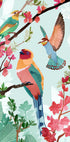 Un'illustrazione vivace e tropicale di uccelli colorati seduti e volanti tra rami e fiori rigogliosi. Con forti sfumature di verde, rosso e blu, l'opera d'arte cattura la gioia e la vitalità della fauna selvatica estiva. Perfetto per aggiungere un tocco fresco ed esotico a qualsiasi stanza.
