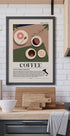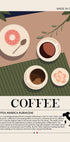 Un poster di ispirazione italiana che mostra una sagoma di tazze di caffè, un dessert e zollette di zucchero su un tavolo. Il poster mette in risalto la storia e il processo di produzione del caffè con un focus sulla tradizione dell'espresso italiano. Perfetto per bar, amanti del caffè e appassionati della cultura italiana.