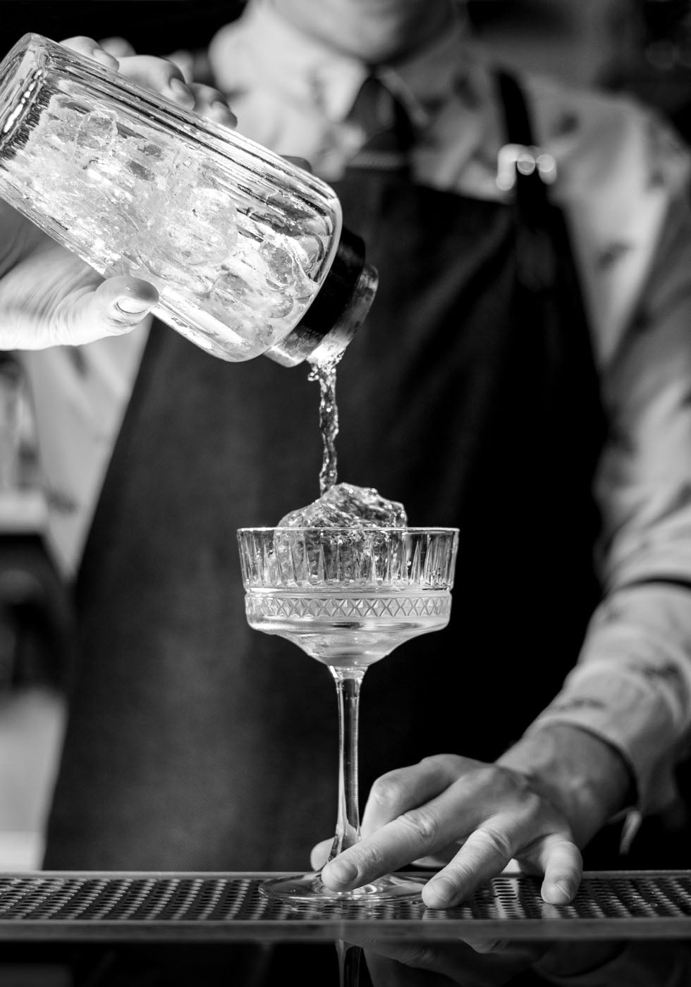 Un'elegante fotografia in bianco e nero che cattura un barista che versa un cocktail in un classico bicchiere da coupé. Il ghiaccio brilla mentre il liquido scorre, creando una scena di mixology senza tempo. Perfetto per la decorazione del bar, per gli appassionati di cocktail o per coloro che apprezzano l'arte del bartending.
