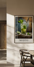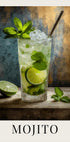 Opera d'arte vivace raffigurante un classico cocktail mojito con foglie di menta, spicchi di lime e cannucce in un bicchiere pieno di ghiaccio. Lo sfondo strutturato accentua l'atmosfera fresca e rinfrescante, perfetta per gli appassionati del bere e dell'arte dei cocktail.