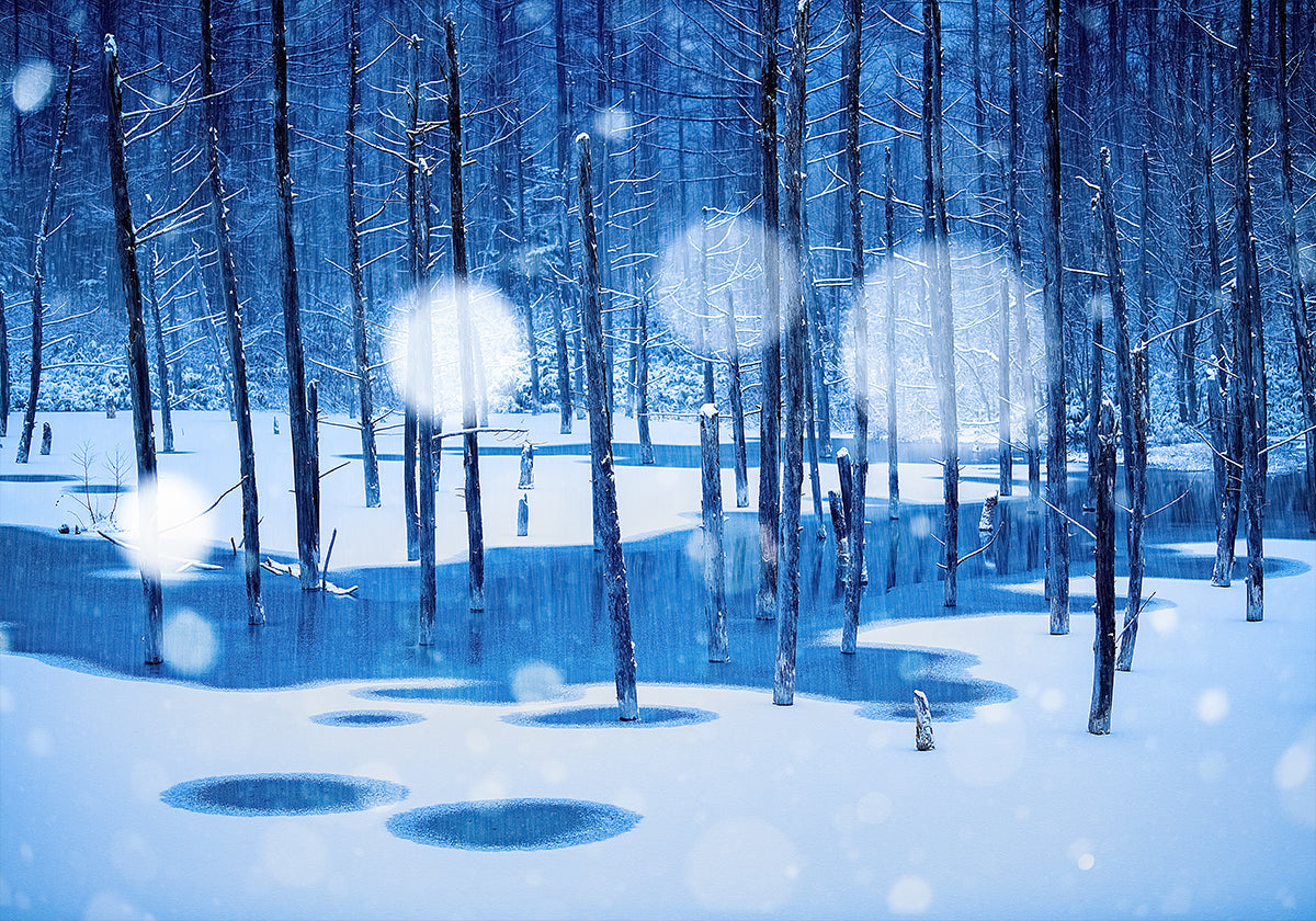 Fairyland di Hidenori Sono cattura un paesaggio invernale da sogno in fresche tonalità di blu: un lago ghiacciato circondato da alberi silenziosi, dove i fiocchi di neve cadono e creano un bagliore da favola. La nebbia è bassa sull'acqua e il riflesso calmo invita all'immersione nella quieta poesia della natura. Una fuga tranquilla nell'avventura blu dell'inverno.