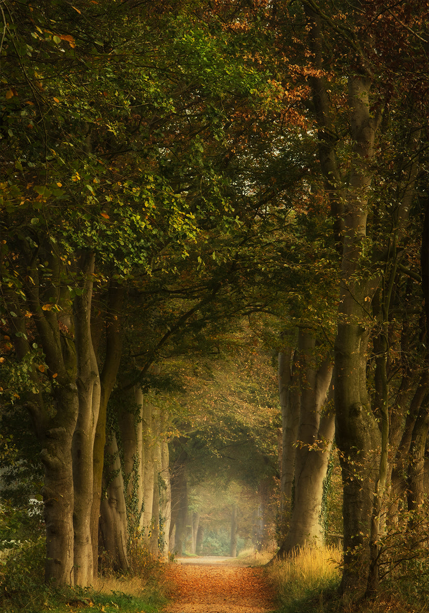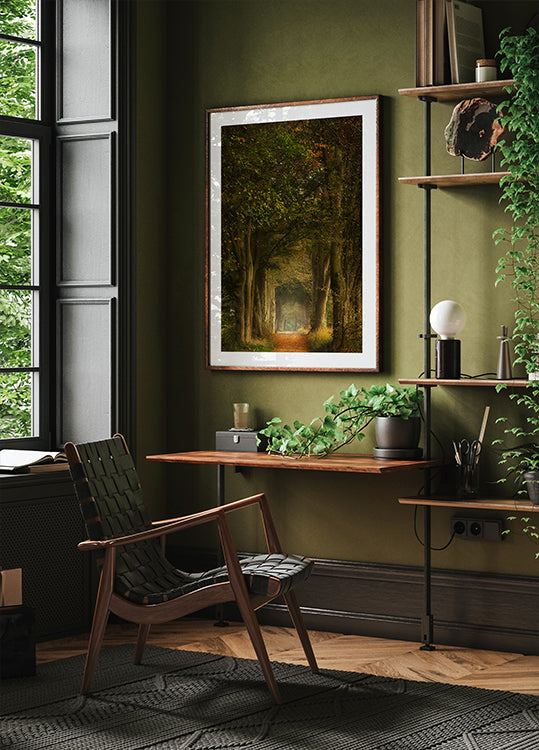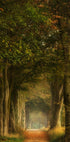 Un sentiero nel bosco da sogno ricoperto di foglie autunnali, circondato da alberi ad alto fusto e morbida luce dorata. Quest'opera d'arte cattura la silenziosa bellezza della natura ed evoca sentimenti di pace, riflessione e viaggi senza tempo attraverso incantevoli foreste.
