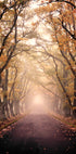 Un vicolo autunnale da sogno fiancheggiato da alte querce, dove le foglie dorate brillano attraverso la soffice nebbia. L'atmosfera nebbiosa crea un senso di calma e mistero, guidando lo sguardo lungo la strada infinita. Una fantastica stampa stagionale che cattura i paesaggi autunnali.