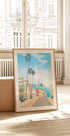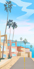 Un'illustrazione costiera luminosa e colorata con palme, case al mare e il mare scintillante. Questa opera d'arte cattura l'atmosfera rilassata dell'estate californiana, perfetta per decorazioni murali ispirate alla spiaggia e ai viaggi.