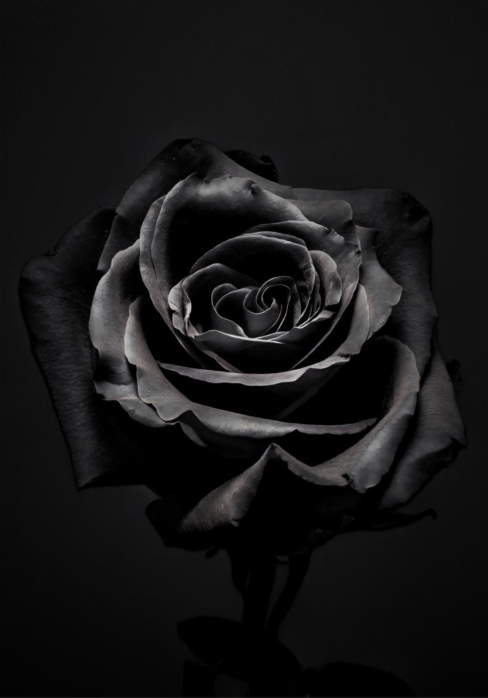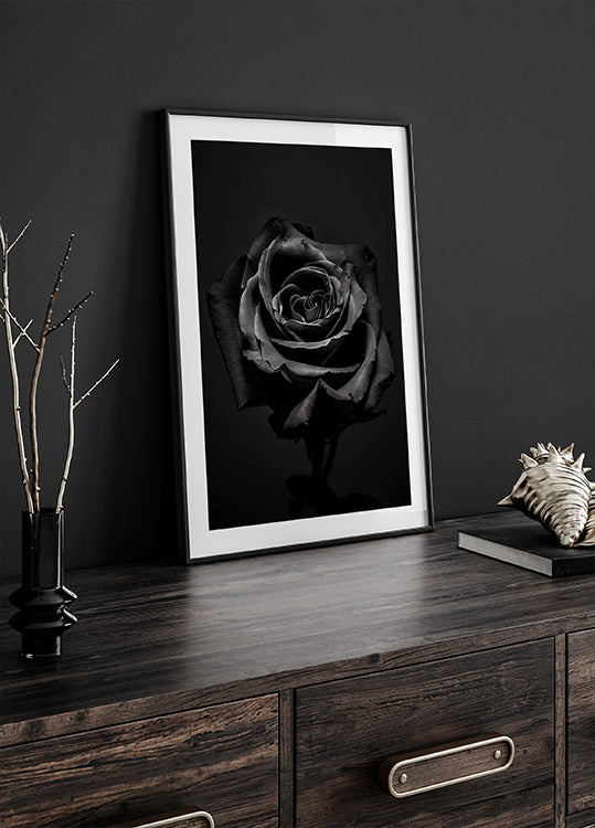 Uno straordinario primo piano di una rosa nera su uno sfondo scuro, che simboleggia mistero, eleganza e forza. Questa drammatica arte floreale è perfetta per interni moderni, gotici e minimalisti.