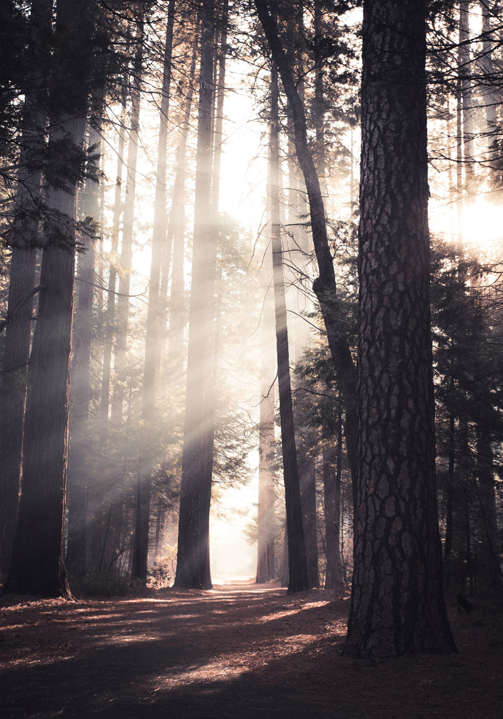 Uno scenario mozzafiato nella foresta della Yosemite Valley, con il sole mattutino che splende tra gli alberi alti, creando un'atmosfera calma e mistica. Perfetto per gli amanti della natura e per chi cerca un arredamento rilassante.