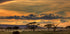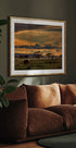 Un poster mozzafiato della savana africana al tramonto, con cieli dorati, nuvole sparse e alberi di acacia che svettano maestosi sulle pianure nebbiose. Un elefante pascola in primo piano, catturando la bellezza cruda della fauna e della natura della Tanzania. Perfetto per gli amanti dei safari e del paesaggio.