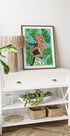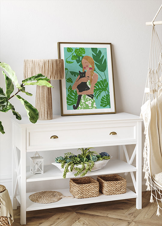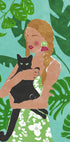 Una vivace illustrazione di una donna che tiene in braccio un gatto nero, circondata da lussureggianti foglie di monstera. I colori forti e l'estetica tropicale forniscono un'espressione calda e moderna, ideale per gli amanti dei gatti e gli interni botanici.