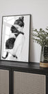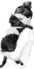 Una delicata illustrazione in stile acquerello in bianco e nero di una donna che abbraccia il suo gatto. Questa delicata opera d'arte esprime amore, intimità e il legame senza tempo tra uomo e animale domestico, perfetta per interni minimalisti e di ispirazione animale.