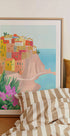 Un'affascinante illustrazione ispirata all'acquerello delle Cinque Terre, Italia. Case dai colori pastello sugli scogli a picco sul mare azzurro, circondate da piante e fiori rigogliosi. Un motivo perfetto per i viaggiatori e la decorazione costiera.