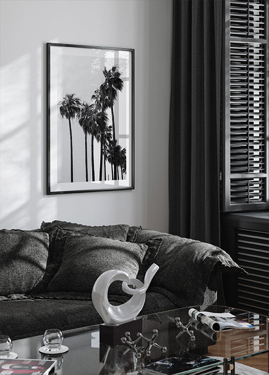 Un'elegante fotografia in bianco e nero di alte palme che ondeggiano al vento. Il design minimalista e senza tempo lo rende ideale per interni moderni e costieri.