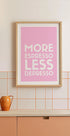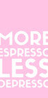 Un poster tipografico giocoso e minimalista con testo bianco su sfondo rosa tenue. La citazione divertente "More Espresso Less Depresso" porta umorismo e motivazione, perfetta per gli amanti del caffè e per l'arredamento moderno della casa. Una dichiarazione divertente per cucine, bar o uffici.