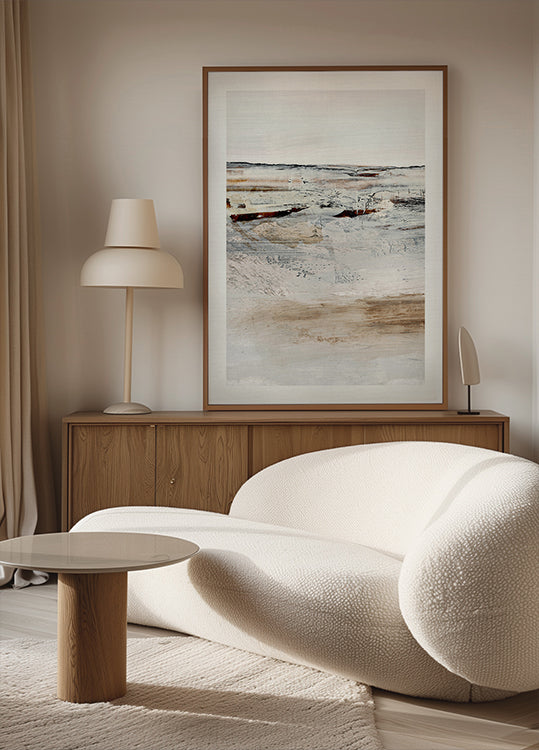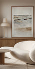 Un calmo dipinto costiero astratto di Dan Hobday, con trame stratificate e morbide pennellate nei toni terrosi del beige, bianco e accenni di ruggine. La composizione minimalista e pittorica evoca la sensazione degli orizzonti costieri e combina l'astrazione moderna con la tranquillità naturale. Un pezzo perfetto per interni moderni con un'estetica costiera o minimalista.
