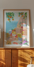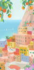 Un'illustrazione colorata della Costiera Amalfitana, dove le case dai colori pastello scendono dalle scogliere verso il mare turchese. Incorniciata da aranci e fiori, l'opera cattura l'essenza dell'estate italiana: l'architettura solare, il fascino mediterraneo e la gioia del viaggio e delle vacanze.