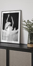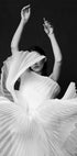 Uno straordinario ritratto in bianco e nero di una donna con un abito scultoreo a pieghe, catturato in movimento. Le pieghe drammatiche e il tessuto fluido creano un senso di ritmo ed eleganza, che ricorda sia la danza che la scultura astratta. Un'audace opera d'arte monocromatica che mescola moda, movimento e arte.