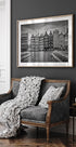 Un'iconica rappresentazione in bianco e nero del Damrak di Amsterdam: le famose case danzanti si ergono in ritmo grafico lungo il canale, con riflessi nell'acqua calma e nuvole drammatiche sopra la città. Melanie Viola cattura la facciata storica e l'impulso urbano in un motivo senza tempo, perfetto per l'interior design moderno e nordico della casa.