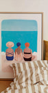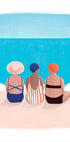 Un'illustrazione luminosa e felice di tre donne sedute insieme in riva al mare a godersi il sole e il panorama. Un'opera d'arte perfetta per portare nella tua casa un senso di vacanza, relax e vibrazioni estive dalla costa.
