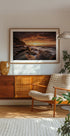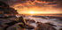 Uno splendido paesaggio marino a Cape Solander, Sydney, catturato all'alba. La luce dorata del sole scorre all'orizzonte, illuminando le onde del mare e le rocce grezze con una luce calda e luminosa. L'acqua setosa, creata dalla lunga esposizione, contrasta magnificamente con il cielo drammatico e pieno di nuvole ed evoca forza e calma.