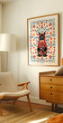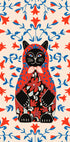 Un'illustrazione giocosa e colorata di un gatto sorridente disegnato come una bambola matrioska russa, decorata con fiori rossi e blu. Perfetto per le camerette dei bambini, interni affascinanti o per chi ama l'arte stravagante dei gatti con un'espressione gioiosa.