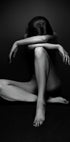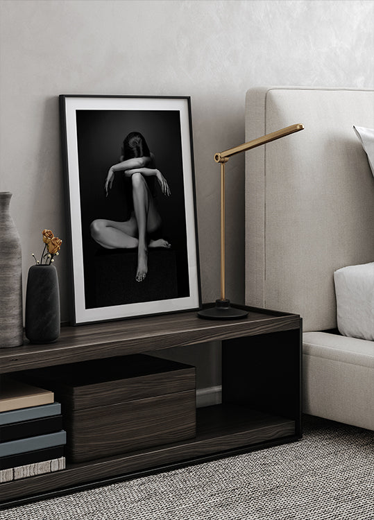 Una forte fotografia artistica in bianco e nero di una donna seduta che esprime emozioni crude, sensualità e vulnerabilità. Con un'illuminazione drammatica e un'espressione monocromatica, l'opera evoca temi di tristezza, forza e malinconia e diventa un accattivante pezzo d'arte figurativa da parete.