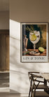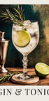 Elegante opera d'arte gin tonic con un bicchiere da gin riempito con cubetti di ghiaccio, spicchio di lime e un rametto di rosmarino. Perfetto per gli appassionati di cocktail, decorazioni da bar o collezioni d'arte a tema drink. Migliora il tuo bar di casa con questo pezzo sofisticato che unisce stile e freschezza.