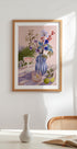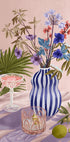 Questa vivace opera d'arte di natura morta presenta un vaso a strisce di fiori colorati, circondato da foglie tropicali e vetro su una superficie strutturata. La composizione crea un mix armonioso di natura ed estetica moderna e aggiunge freschezza ed eleganza a qualsiasi stanza.