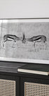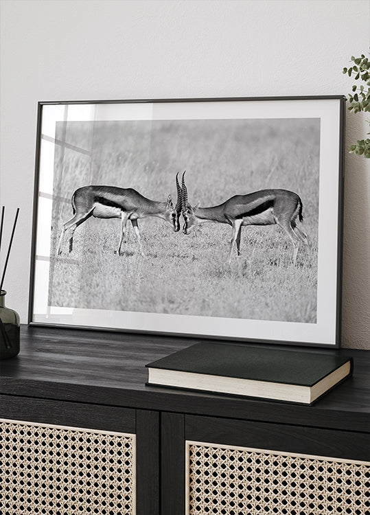 Una potente fotografia di animali in bianco e nero di due gazzelle che si affrontano in un duello, le loro corna si scontrano con forza e sfida. Catturata nella vasta savana del Serengeti, questa immagine trasmette energia pura, sopravvivenza e lo spirito senza tempo della natura selvaggia.