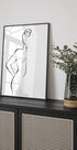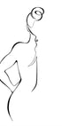 Un disegno minimalista di una donna vista da dietro, realizzato con linee nere fluide su uno sfondo bianco chiaro. Questa opera d'arte figurativa astratta enfatizza la semplicità, l'eleganza e la forma ed è ideale per interni moderni e minimalisti.