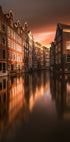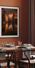 Amsterdam Evening di Luca Rebustini raffigura la calma del tramonto sui canali della città. Case strette a due spioventi si ergono fianco a fianco, specchiate nell'acqua scura, mentre finestre calde e strade acciottolate suggeriscono la vita dietro le facciate. Un suggestivo tributo all'architettura senza tempo di Amsterdam. Perfetto per portare nella stanza ricordi di viaggio e malinconia nordica.