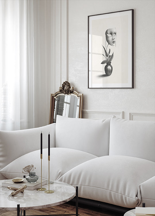 Un'illustrazione surreale in bianco e nero di una misteriosa maschera fluttuante che cresce dal gambo di una pianta in vaso. La combinazione di elementi organici e artificiali crea un contrasto sorprendente ed evoca temi come identità, trasformazione ed emozioni nascoste. Un'aggiunta perfetta all'arte concettuale e agli interni moderni.