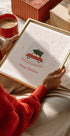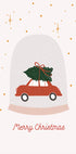 Step into festive nostalgia with this Menina Lisboa illustration: a retro red car topped with a lush Christmas tree cruises a snowy country lane toward a cozy farmhouse, all nestled inside a snow globe. Cheerful Merry Christmas lettering and vintage hues bring warm holiday charm. Soft pink skies and evergreen accents glow with cozy winter whimsy.