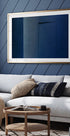 Un'opera d'arte architettonica minimalista nei toni del blu che mette in risalto forme geometriche e una porta misteriosa. La luce e le ombre creano un'atmosfera di eleganza e mistero.