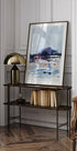 Helena Ryhles Misty Lake Reflections indfanger en tågeklædt sø, hvor himlen spejler sig i stille vand. Subtile blå og gyldne nuancer glider sammen i et minimalistisk akvarellunivers, der emmer af ro, efterår og nordisk natur. Et moderne, stemningsfuldt blikfang til hjemmet. Inspireret af Islands landskaber skaber værket en følelse af tidløs ro.