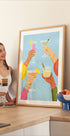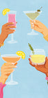 Un'illustrazione vivace e colorata che celebra l'amicizia e la gioia. Quattro mani alzano i bicchieri da cocktail in un'allegra ciotola su uno sfondo blu brillante, piena di calore, positività e comunità, perfetta per cucine, bar o soggiorni moderni.