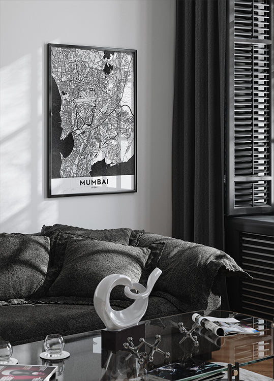 Discover Mumbai in crisp cartographic style: a sleek, minimalist city map tracing the island metropolis from the Arabian Sea coastline to winding creeks and peninsulas. Fine street networks and district contours capture the energy of Colaba to Bandra, creating a timeless urban statement for modern interiors.